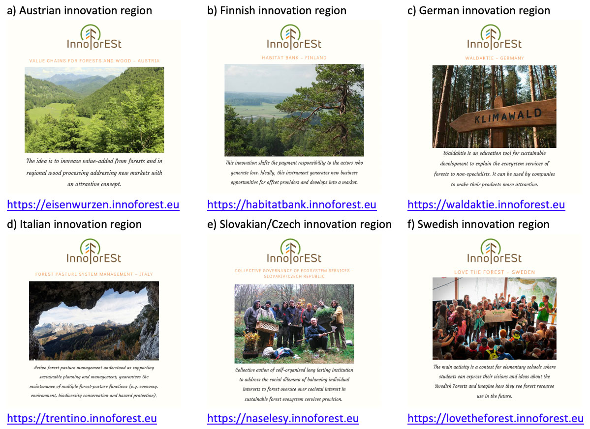 InnoForESt is an innovation action funded through the Horizon 2020 program of the European Union. It aims to explore innovative governance approaches in the European forestry sector to spur the increased provision of a wide array of different forest ecosystem services, including provisioning, regulating, cultural, and supporting ecosystem services. To foster the development of innovative governance solutions in the forestry sector for policy and business, it draws from six already existing forest governance innovations, which are interesting for further development and to be up-graded, up-scaled, and potentially replicated. These governance innovations are located in seven European countries: Austria, Finland, Germany, Italy, Slovakia/Czech Republic, and Sweden. Across these initiatives, the project brings together a wide network of actors including science partners, such as universities and research institutes, as well as practice partners, like environmental and forestry agencies, non-governmental organizations, small-and medium sized enterprises, and forest owners and managers. Thereby, the project employs a participatory multi-actor-approach, which puts the real-life needs of the involved practice partners from the forestry and forest-related sectors at the heart of the project. The science partners support the innovation process by facilitating exchange among all involved actors for the mutual assessment and further-development of the selected and already existing innovation initiatives through suitable communication infrastructures and methods. Together, science and practice partners constitute a so-called 'innovation team' in each case study region, in the following referred to as an 'innovation region'.