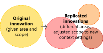 • Replication, which refers to making an innovation transferable and applicable for a different region and context, also adjusting the scope as preferred by the new network of actors (e.g. by designing communication measures to make others aware of the original innovation in order to make them think about copying and transferring it to their own region, providing guidance and advice to the new set of actors on how to adapt it to their specific context conditions in case it cannot be copied one-to-one, and replicating a funding mechanism for a new forest ecosystem service in the new area)