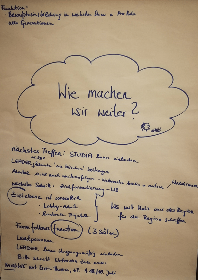 - The organizational form results largely from the agreed objectives and the concrete projects/innovation ideas realized (see the discussion contribution of Gabriel Gruber “Form follows function” as well as the ‘Sauwaldtrailer’ as lead/key project for the ARGE s’Hoiz). Both must now be formulated/identified by the stakeholders themselves for the Eisenwurzen. No (external) project team or Erwin Thoma can take over this task for the stakeholders.