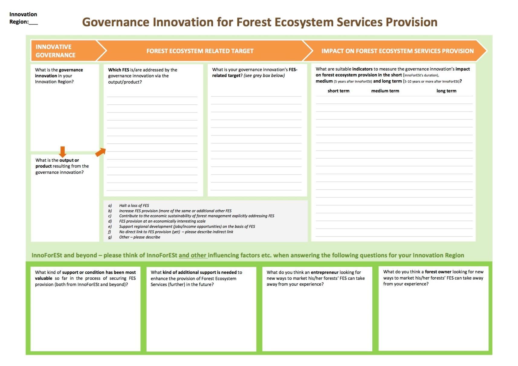 Global environmental problems, increasing urbanisation, industrialisation pressures, and market dynamics among others, hamper the balanced provision of the full range of forest ecosystem services (FES). At the same time, societal demand, particularly for regulating and cultural FES is increasing. Yet thus far, forest owners are usually unable to generate revenues off the broad range of ecosystem services their forests provide, forcing them to base management decisions on marketable goods, mainly on timber production. Between 2017 and 2020 InnoForESt has worked with and in six local level initiatives across Europe to analyze and (further) develop innovative governance mechanisms for securing FES provision and financing. The governance innovations in focus can largely be grouped into network-centered and payment mechanism-centered approaches.