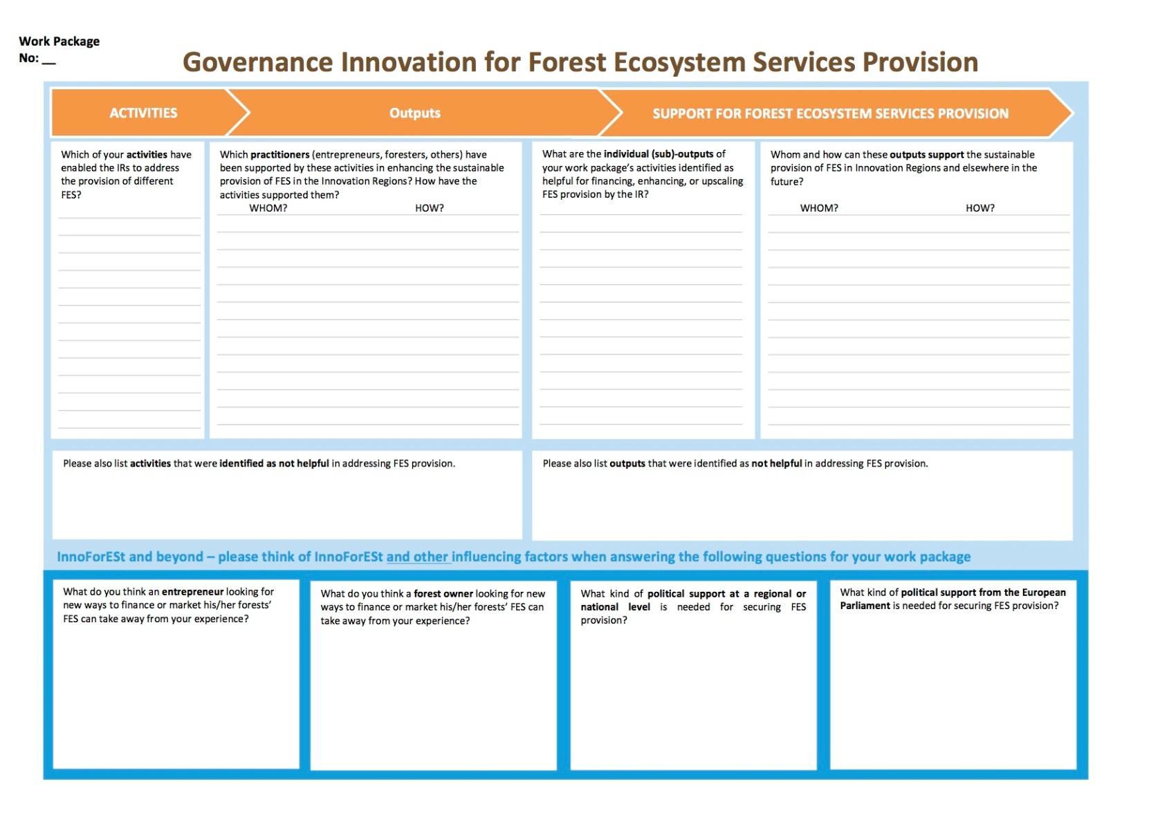 The annex further includes templates used in the context of an interactive session at a consortium meeting in 2019, which focused on the governance innovations (potential) impact on FES provision in the IRs and related recommendations to draw from the IRs’ and WPs’ insights. The templates are referenced in the text.